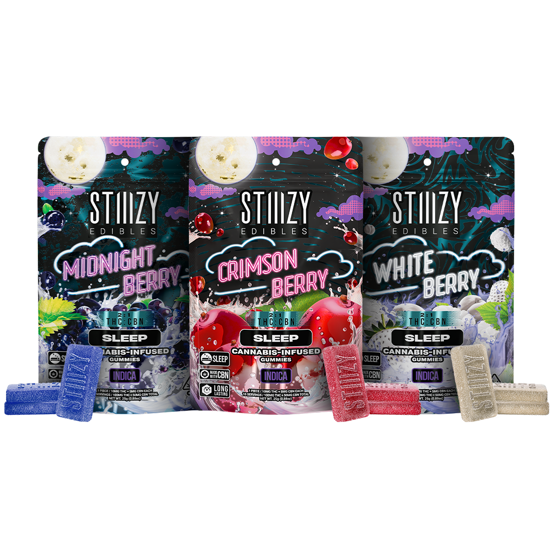 STIIIZY Sleep Gummies feature a 2:1 ratio of THC to CBN, crafted for evening use with thoughtfully selected ingredients and rich, fruit-inspired flavor. This formula brings together 100MG of THC and 50MG of CBN per bag, divided into ten 10MG THC pieces with a consistent microdose of CBN in each.